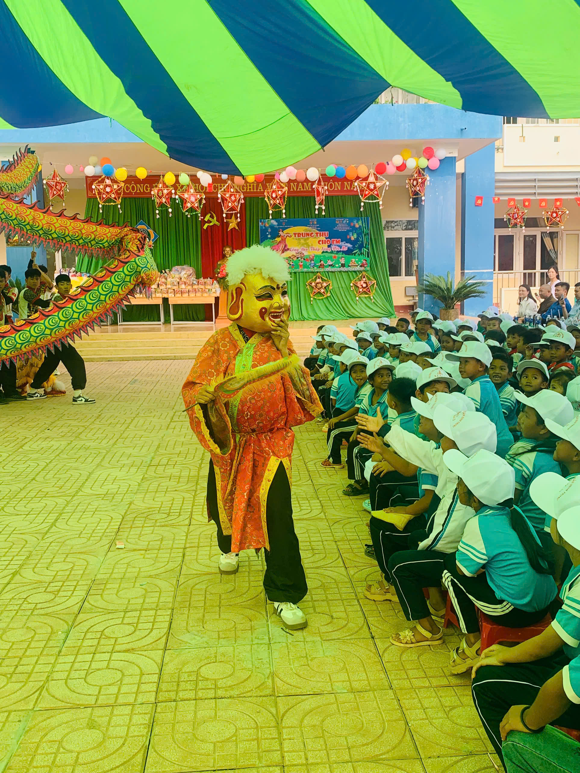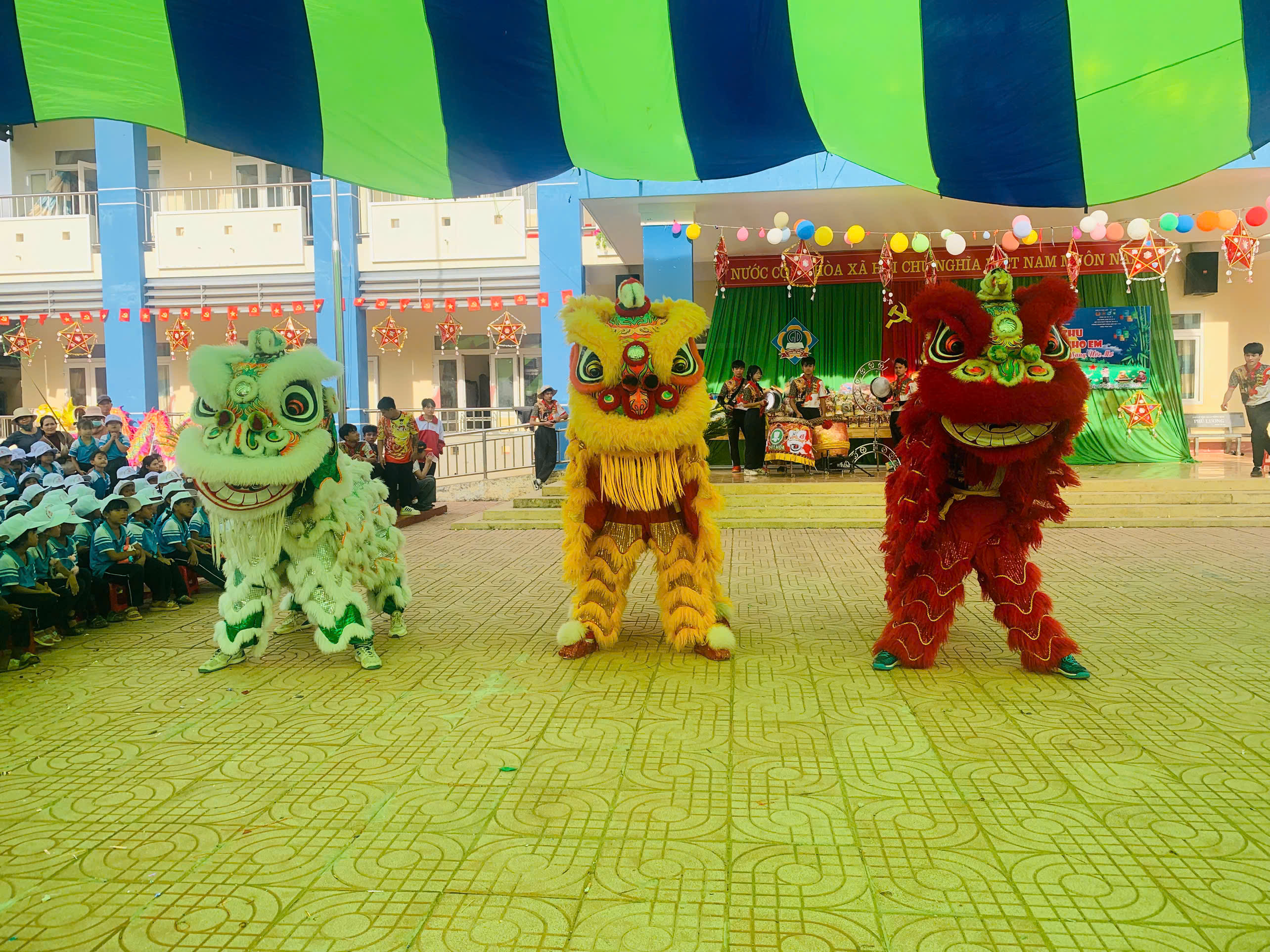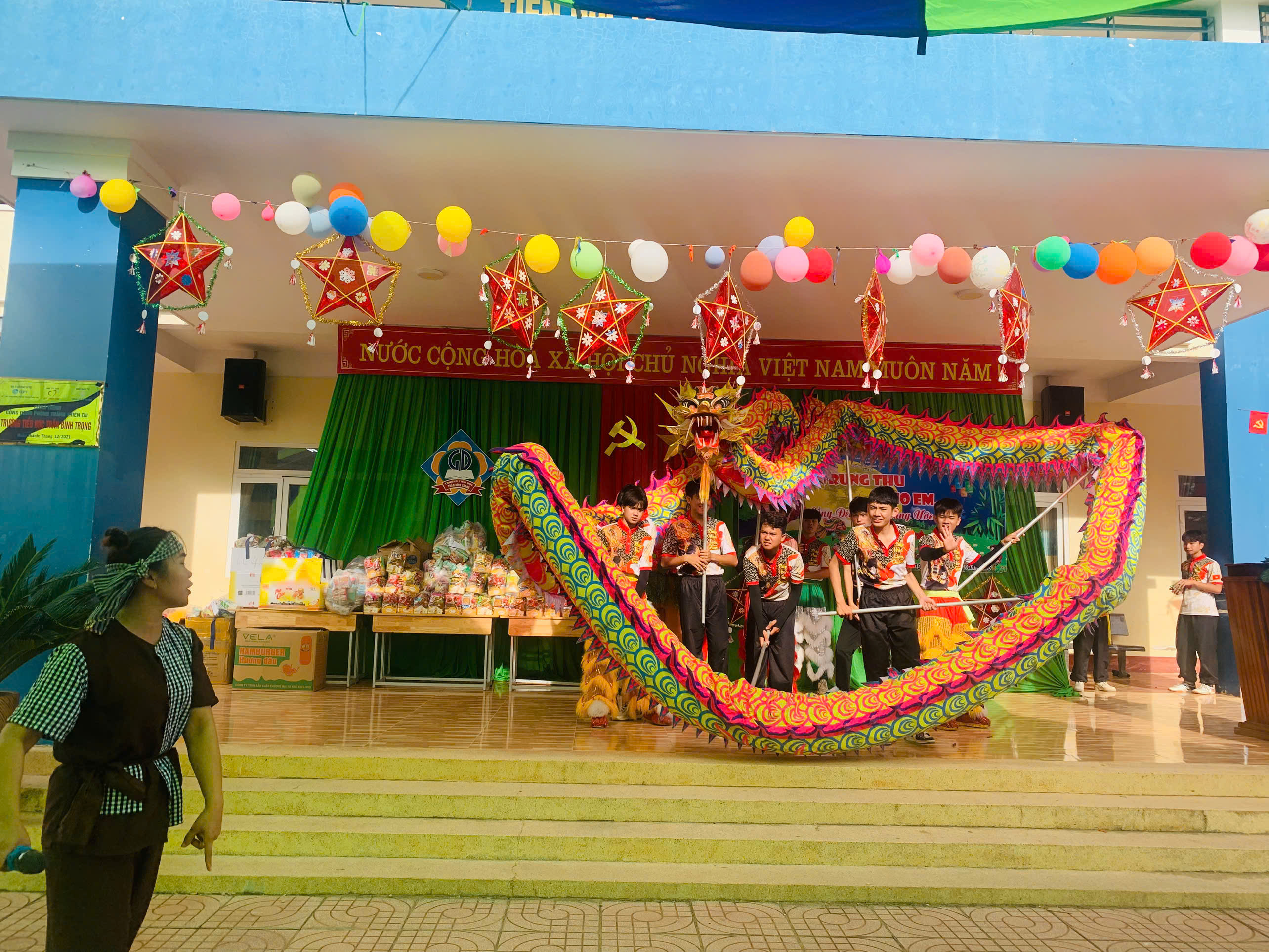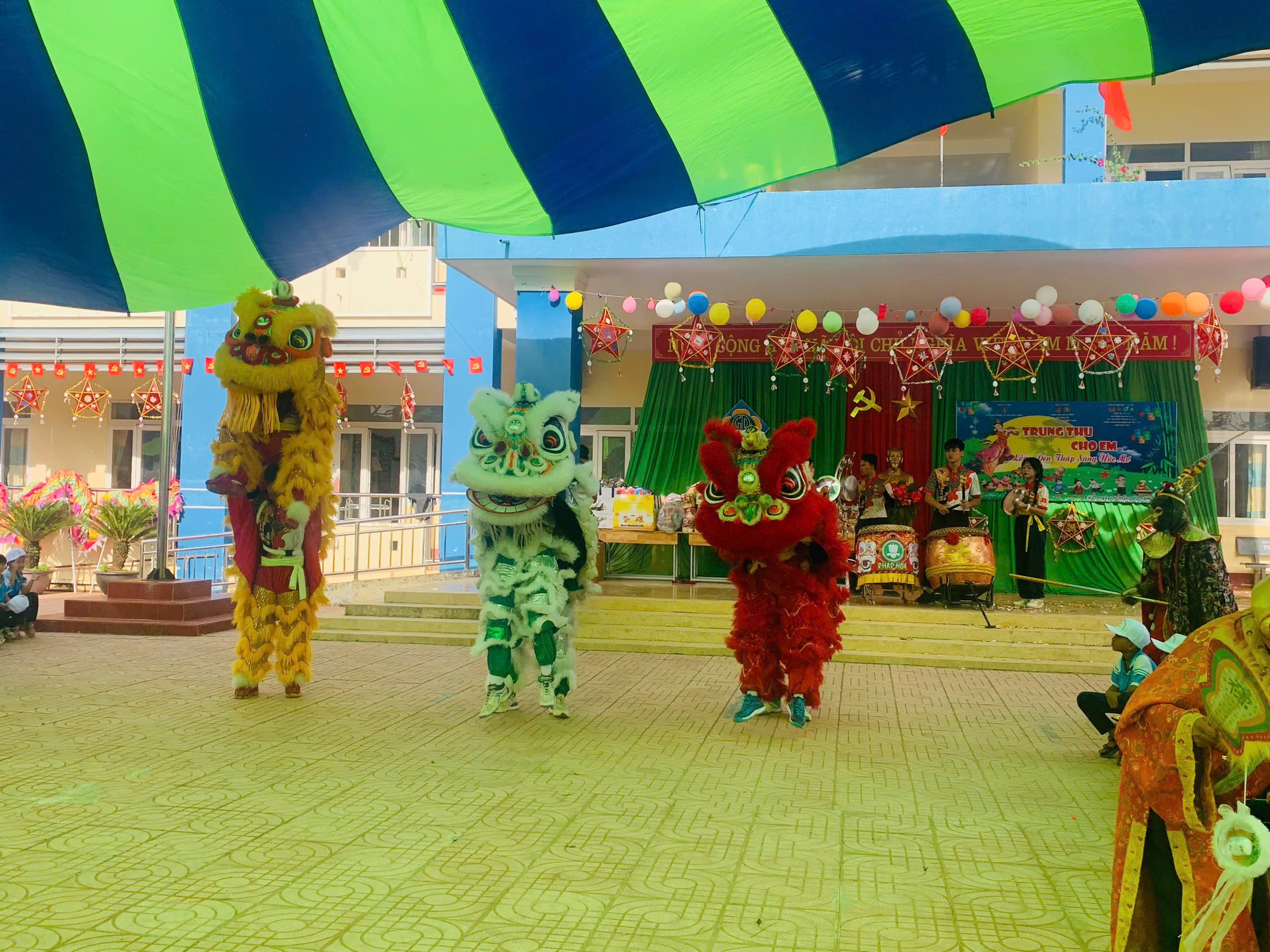 Ngay từ buổi chiều, sân trường đã rực rỡ sắc màu với những chiếc đèn lồng, mâm ngũ quả, cờ hoa và những bàn quà đầy ắp bánh kẹo. Tiếng trống múa lân vang rộn rã, tiếng cười nói của các em hòa quyện trong bầu không khí ấm áp, thân thương.