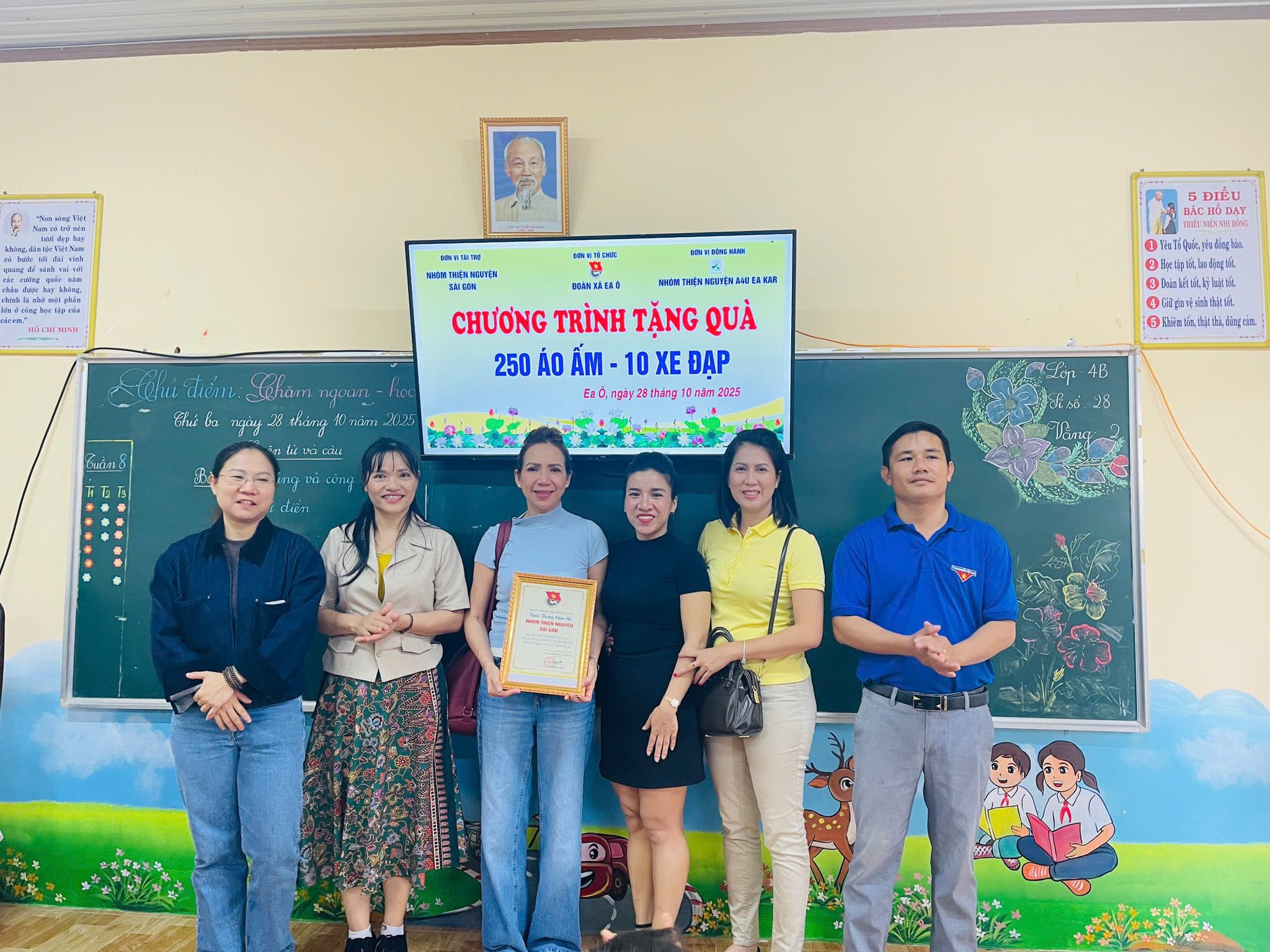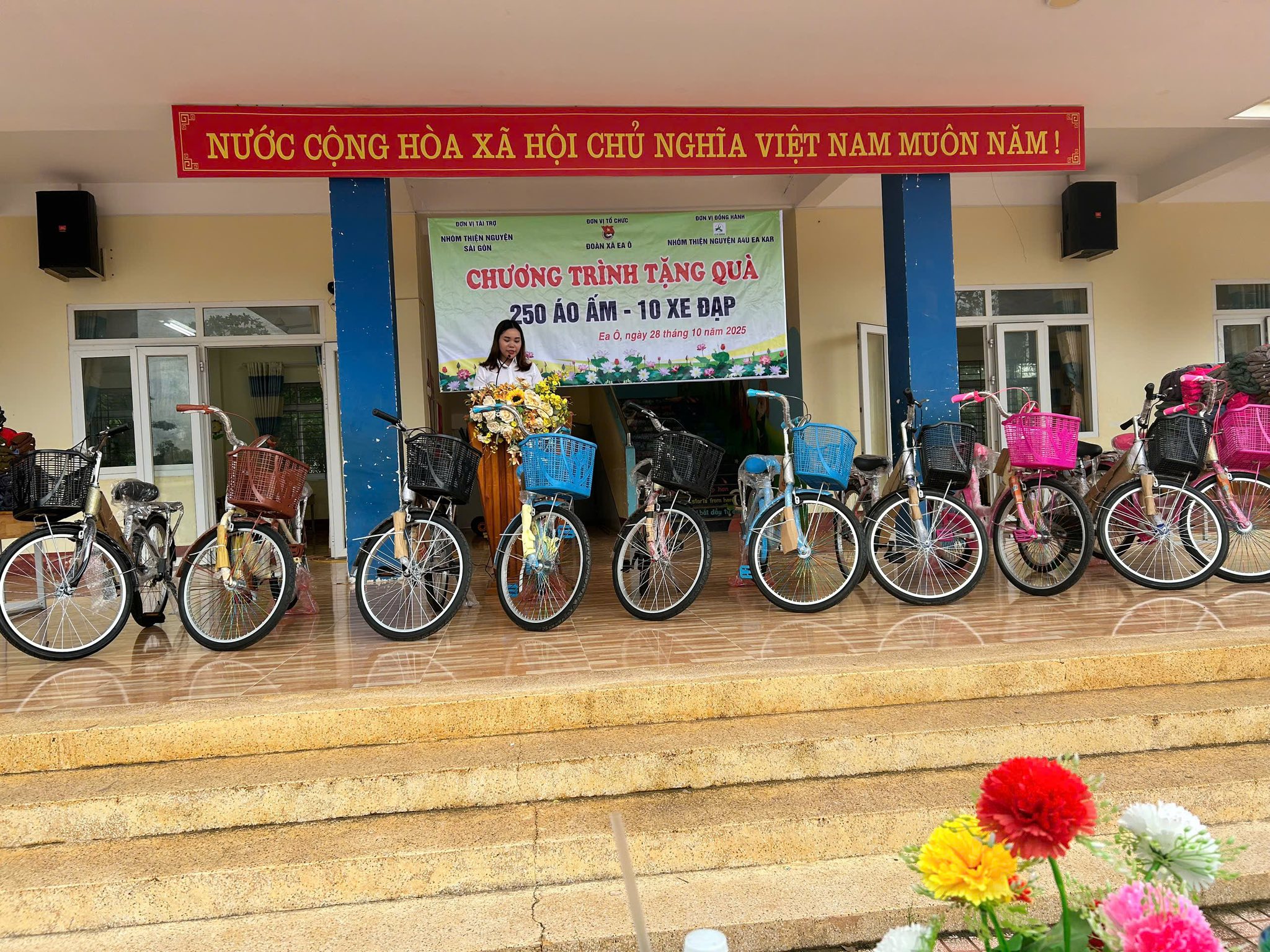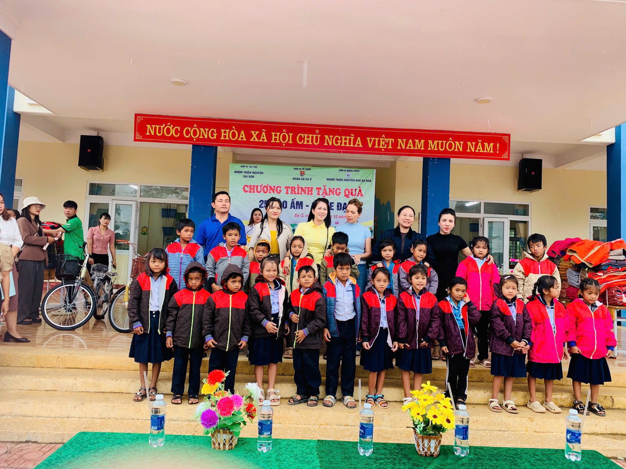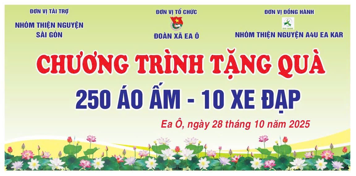 Ban Thường vụ Đoàn xã Ea Ô xin trân trọng gửi lời cảm ơn sâu sắc đến Nhóm thiện nguyện Sài Gòn và đơn vị đồng hành A4U Ea Kar đã quan tâm, chia sẻ và đồng hành cùng địa phương trong hoạt động trao tặng 250 suất quà áo ấm và 10 chiếc xe đạp cho các em học sinh có hoàn cảnh khó khăn tại điểm trường Trần Bình Trọng xã Ea Ô.
