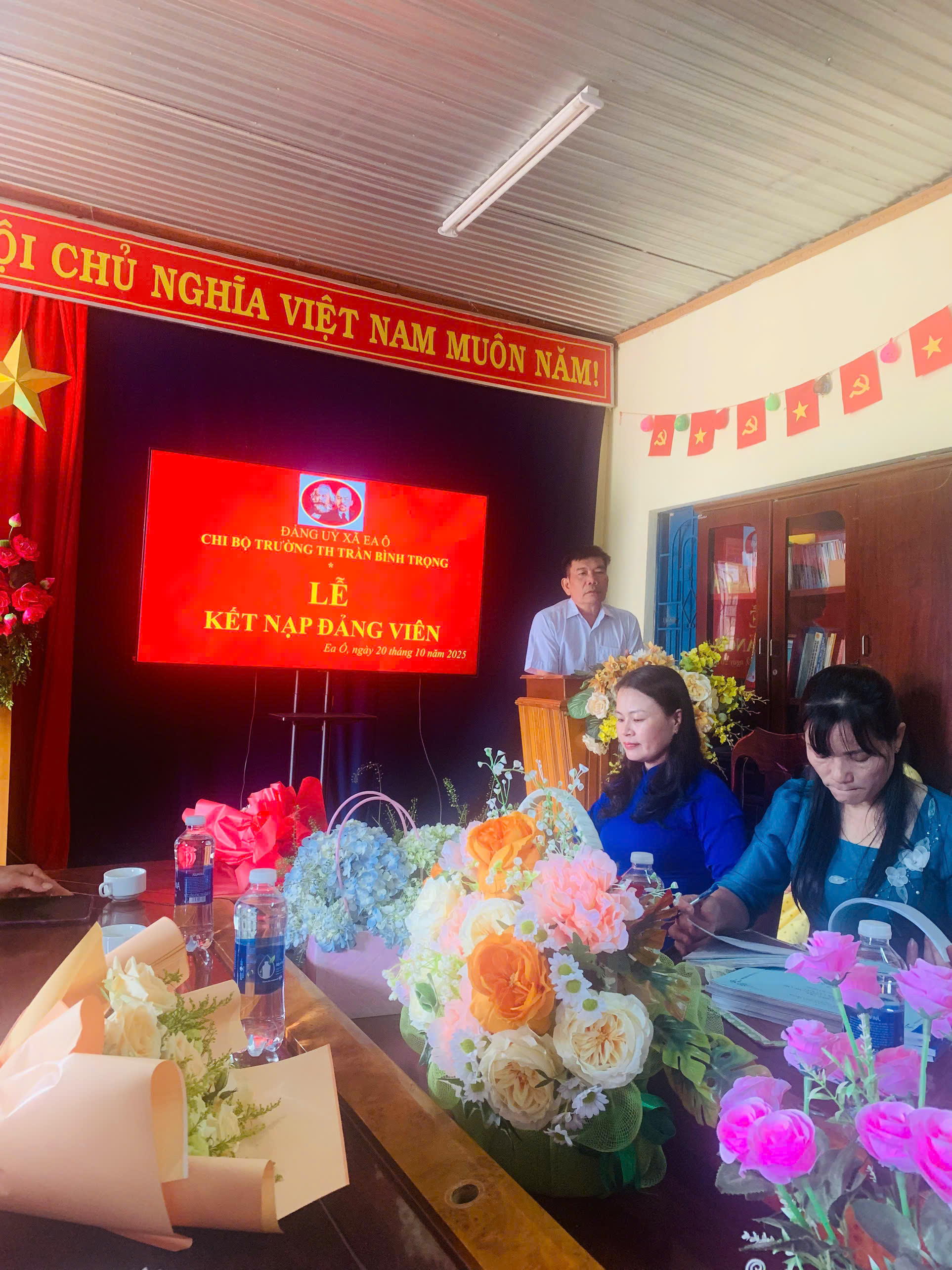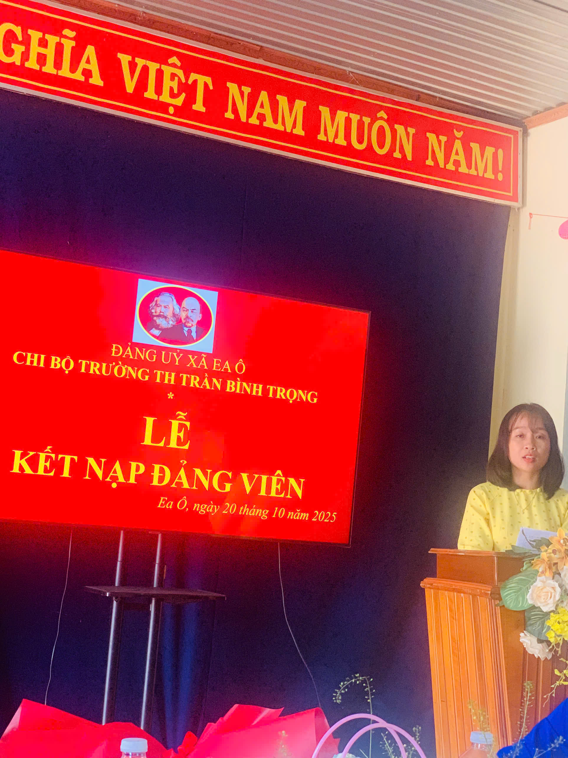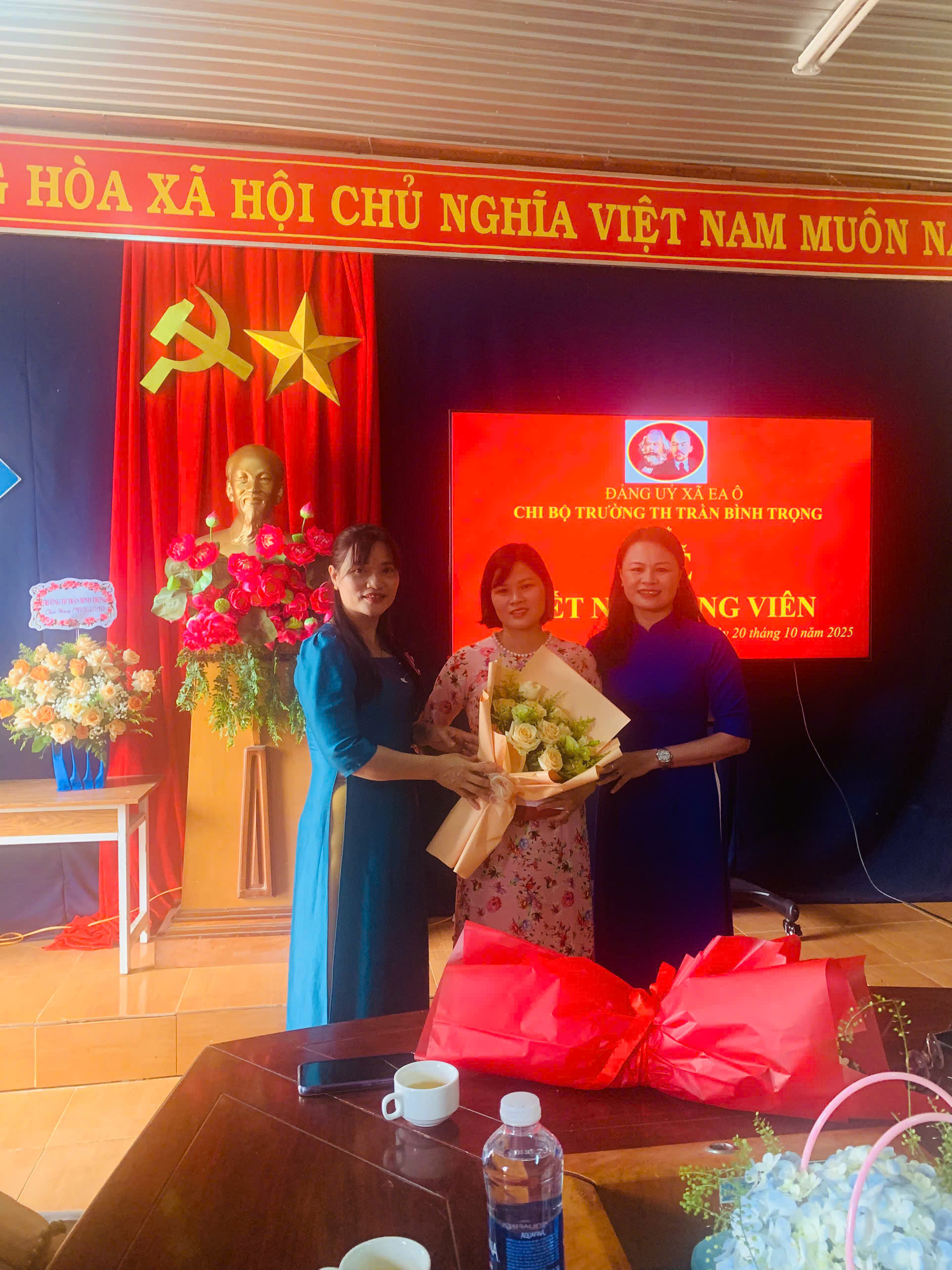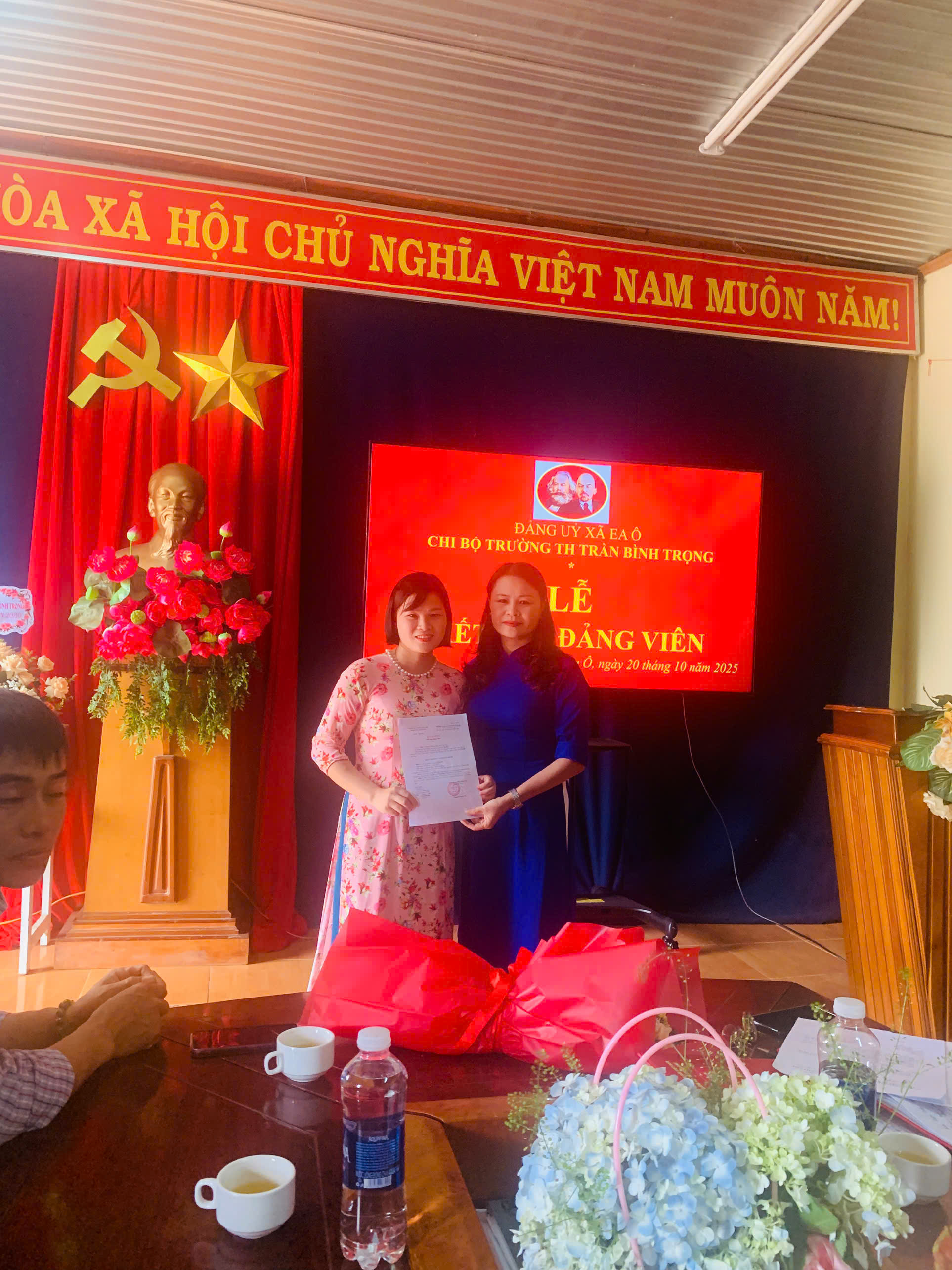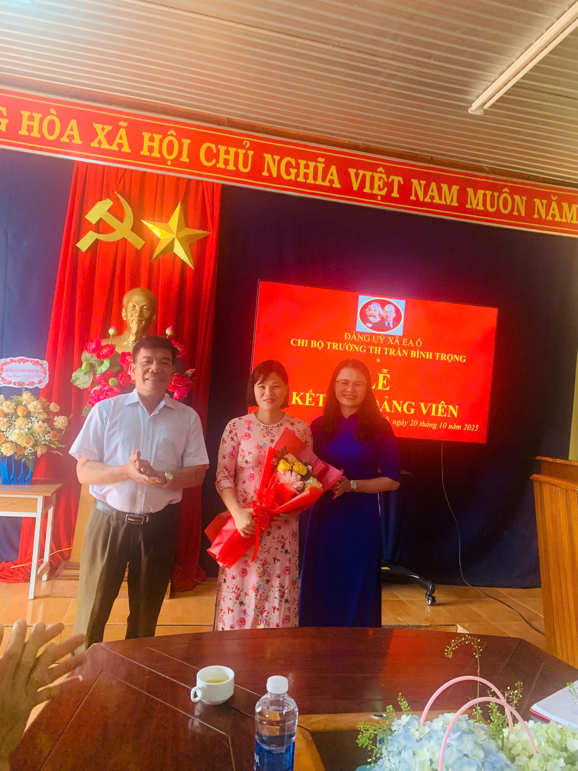 Hòa trong không khí thi đua sôi nổi của cả nước chào mừng kỷ niệm 95 năm ngày thành lập Hội Liên hiệp Phụ nữ Việt Nam (20/10/1930 – 20/10/2025), sáng ngày 20 tháng 10 năm 2025, Chi bộ Trường Tiểu học Trần Bình Trọng, xã Ea Ô, tỉnh Đắk Lắk đã long trọng tổ chức Lễ kết nạp Đảng viên mới cho đồng chí Lý Thị Hà – một giáo viên tiêu biểu của nhà trường.